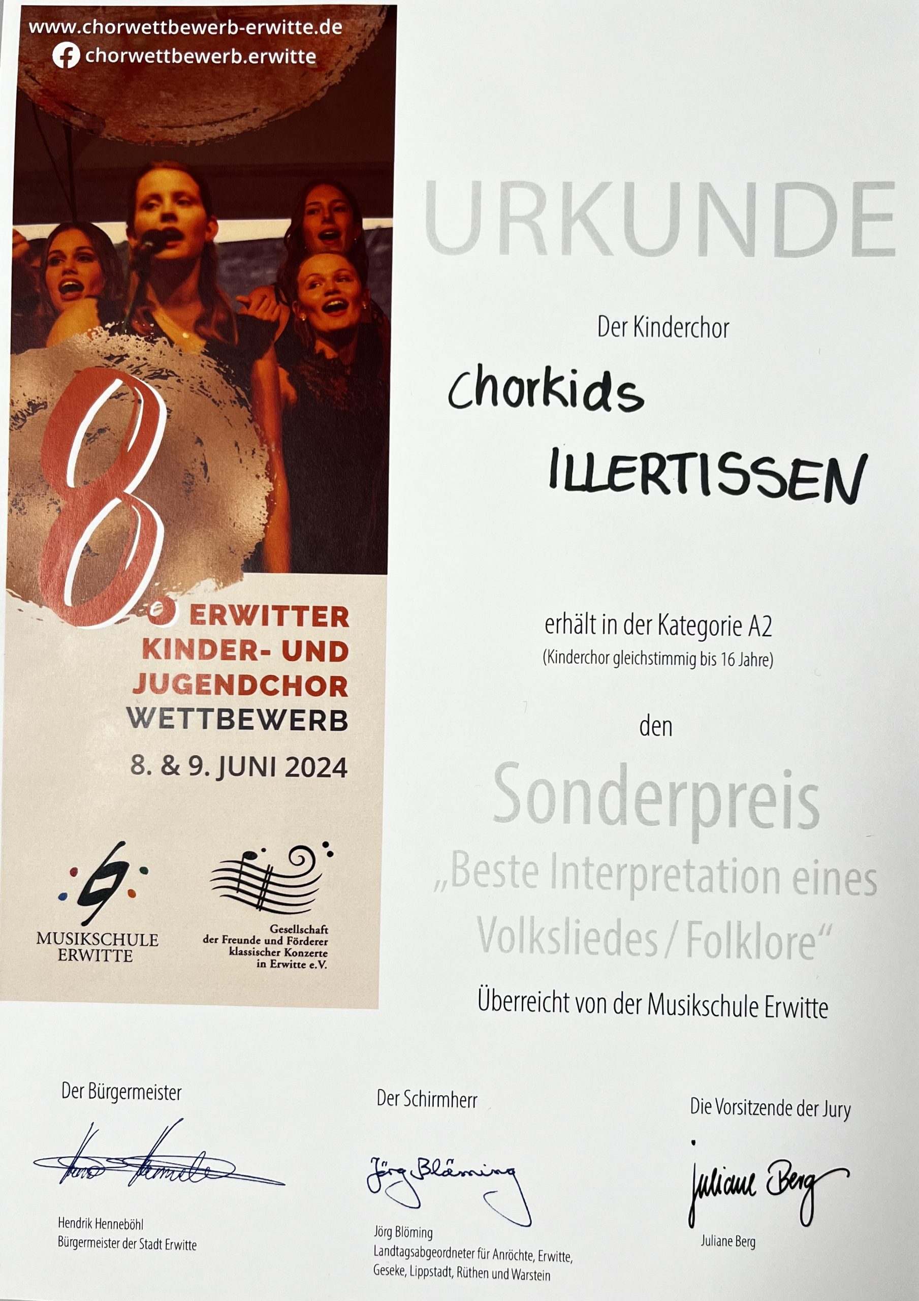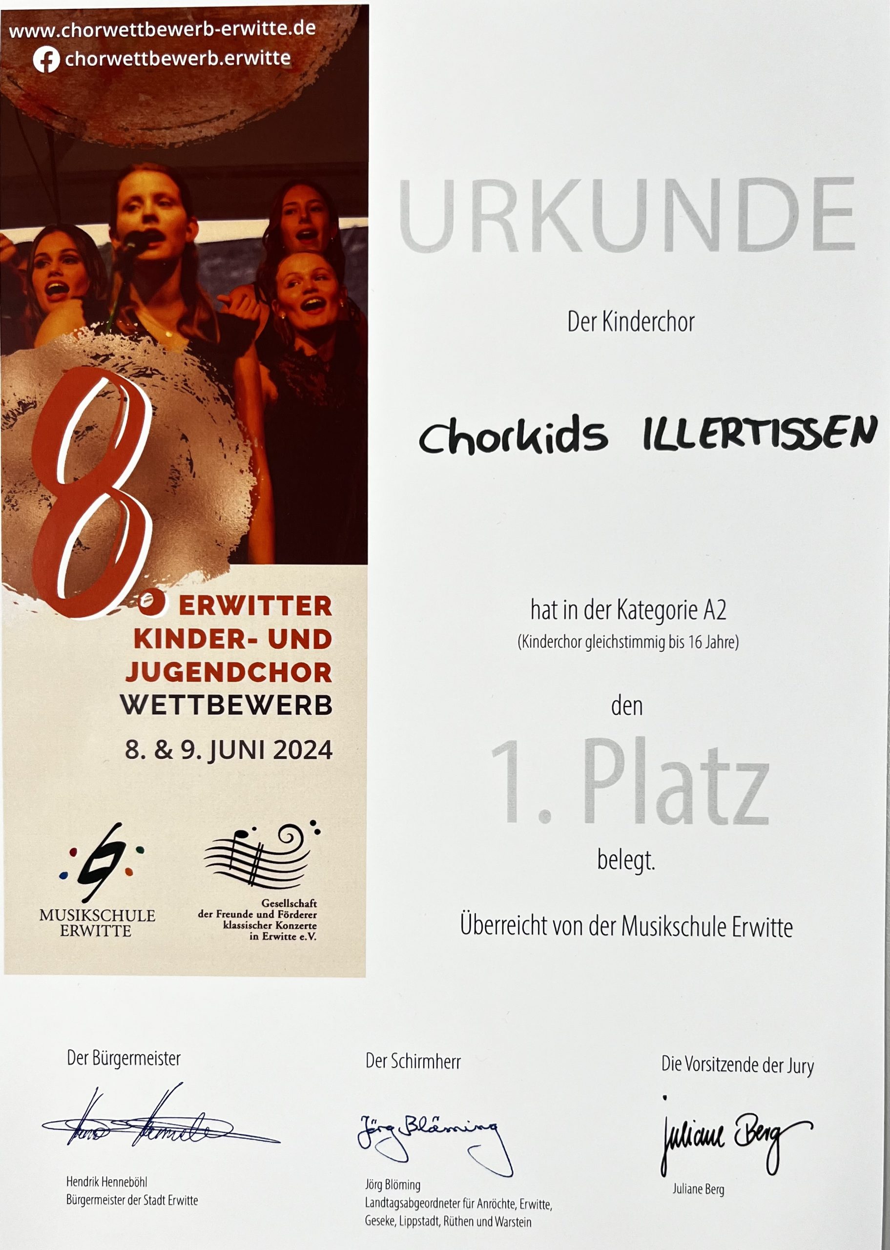 1. Platz des Erwitter Kinder- und Jugenchorwettbewerbs.
